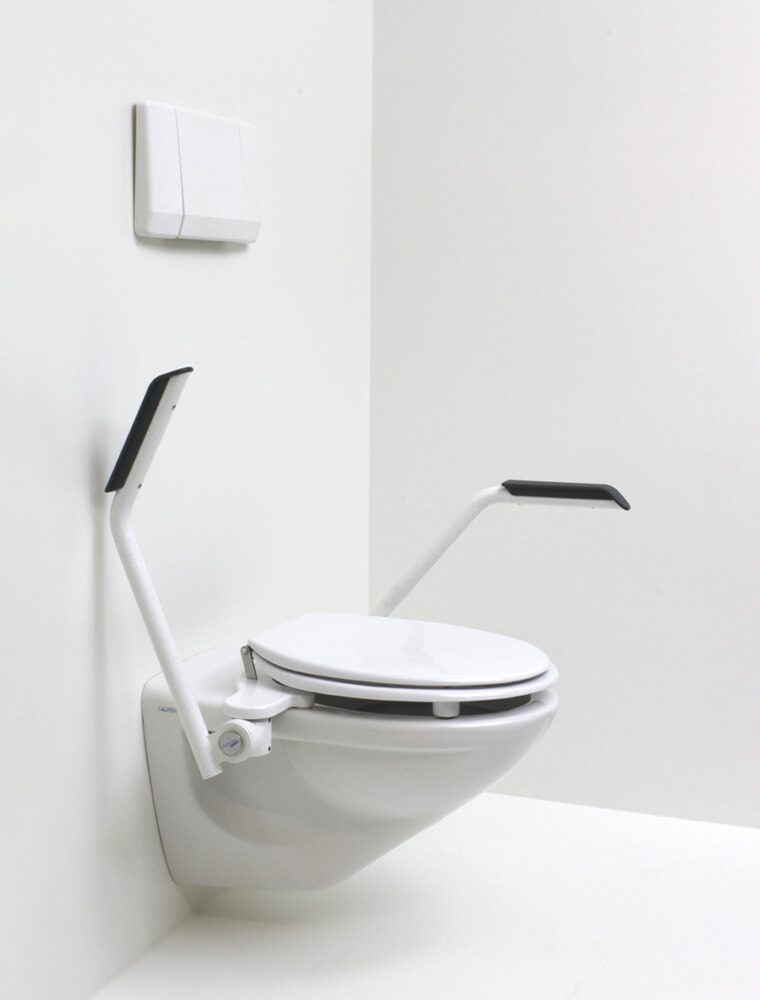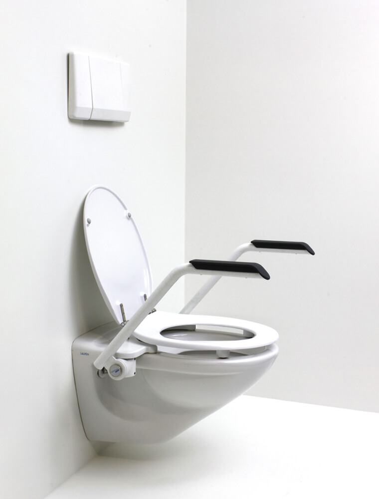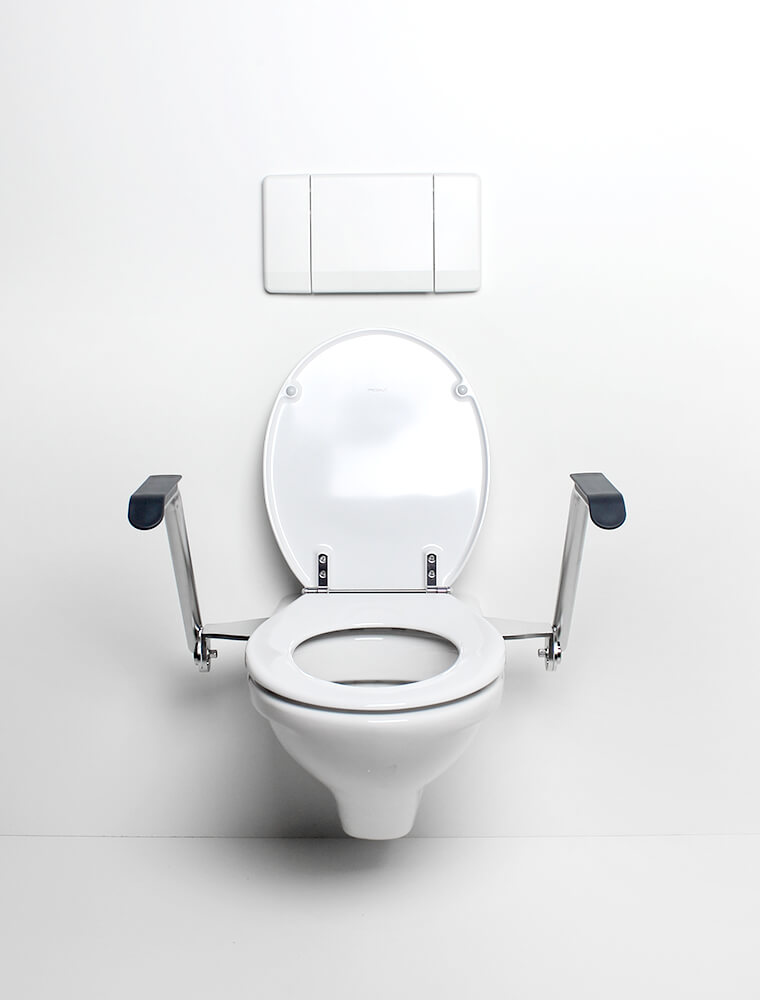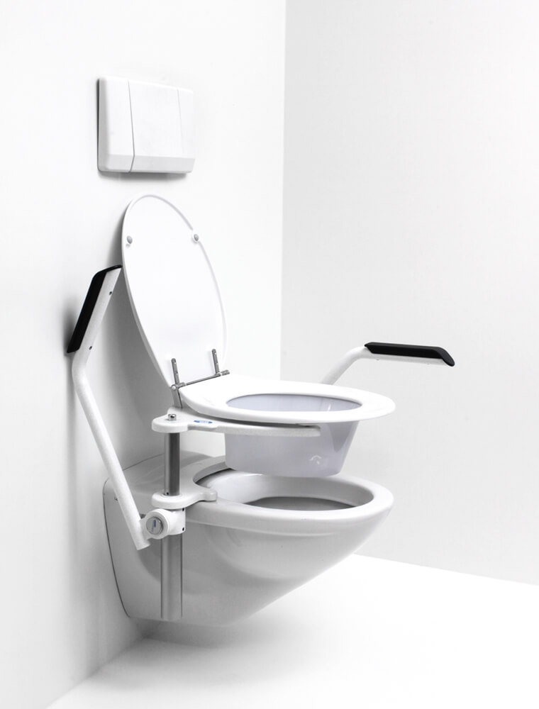 Die fix eingestellte Toilettensitzerhöhung T-10 ermöglicht leicht erhöhtes Sitzen. Die Armlehnen bieten zuverlässigen Halt.